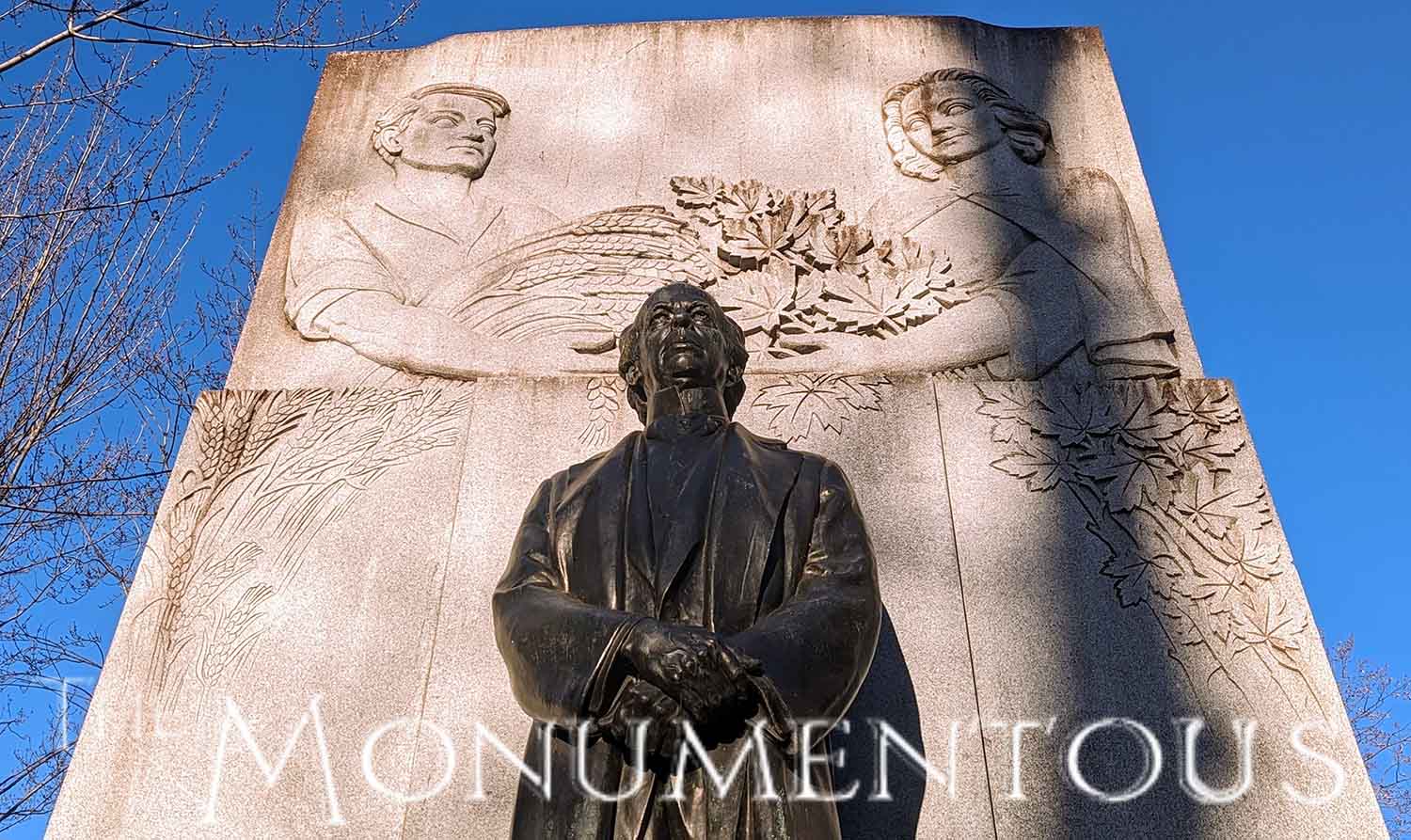 Canada’s first French-Canadian prime minister is honored with the Tribute to Sir Wilfrid Laurier that was created in 1953. A statue of Laurier resides under granite relief of the provinces created and united under his administrations. Above him is a bas-relief of man and woman sharing the harvest.